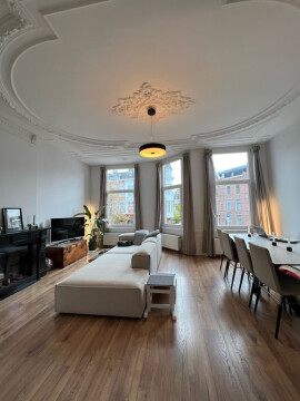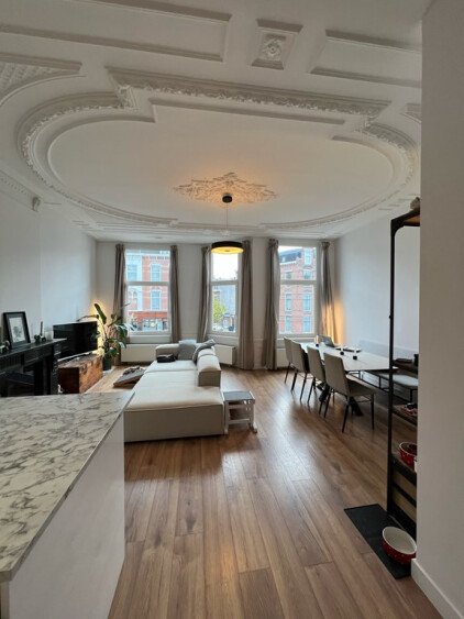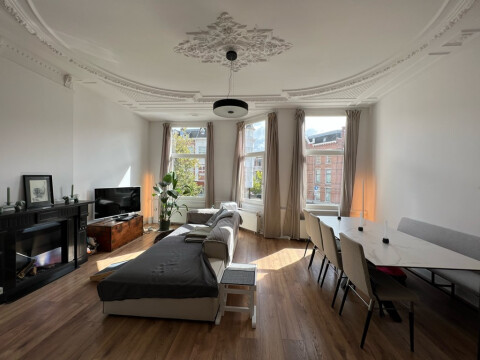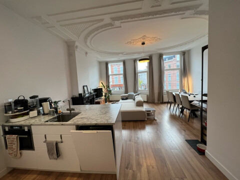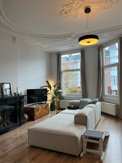Welcome to your new home! This beautifully renovated, high-end apartment with a fantastic terrace located on the first floor of an elegant townhouse in the highly sought-after Duinoord area of The Hague. Perfectly blending classic charm with modern luxury, this apartment offers an ideal retreat, just minutes from the city center and beach. Featuring breathtaking original ceiling with ornaments, marble (gas) fire place and wooden details. Fully updated with all modern comforts, modern and luxury kitchen with island and bathroom with walk-in rain shower and bath! In addition, the apartment is fitted with double glazed windows, Philips Hue lights system, black and glass French double doors in both the living- and bedroom. The apartment carries in a ton of light, in both the morning and afternoon, which can be enjoyed on the 12m2 balcony terrace, surrounded by trees!