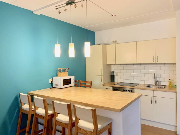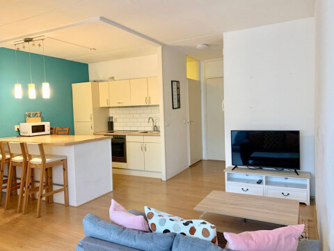 Elevator access to the fourth floor. Hallway leading to the apartment door. The door opens up into a semi open hall, that gives acces to the living room with large windows in the front. Open kitchen with induction stove and kitchen island, fridge / freezer and combi oven. The balcony can be accessed from the kitchen. Comfortable boxspring bed. Bathroom with shower, toilet, and sink. Room with wardrobe and washing machine. Laminate floorings and double glazed.