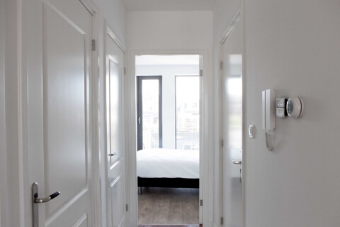 Gezamenlijk entree, entree naar apartement, lift, lichte woonkamer met aangrenzend moderne open keuken inclusief divers inbouwapparatuur, woonkamer en aparte slaapkamer. Badkamer is voorzien van wastafelmeubel, inloopdouche en toilet.