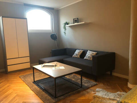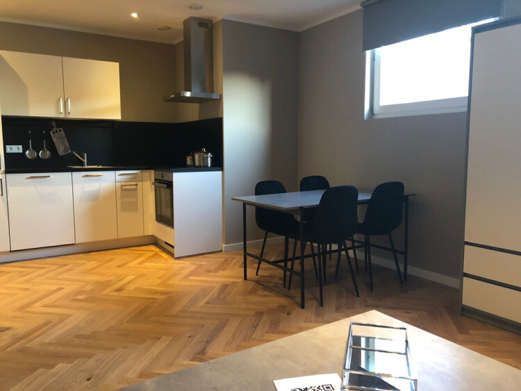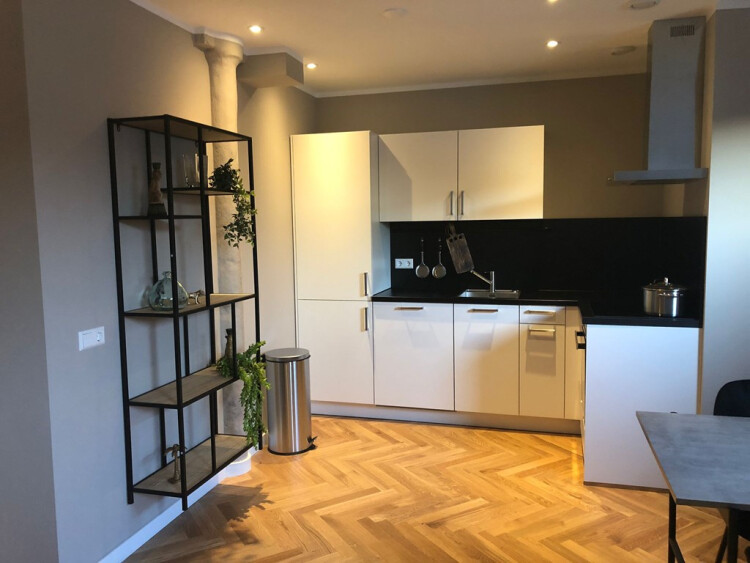 Entrance from the street. Stairs to the second floor with long hallway. Doors to all the apartments. Entrance to the apartment to small hall which is attached to the living area with modern open designer kitchen. Kitchen with appliances such as dishwasher, stove, oven / microwave, ample storage space and fridge / freezer. Bedroom with comfortable boxspring bed and wardrobe space. Bathroom with walk-in shower, sink, towel radiator and toilet. Wooden parquet flooring, centrally heated.